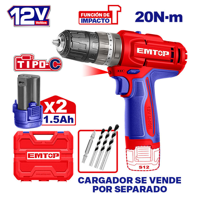 [ECIDL12206] - Taladro Percutor Atornillador Inalambrico 3/8, 12V. 20Nm, 2 Baterias Entrada Tipo C. Sin Cargador. Emtop