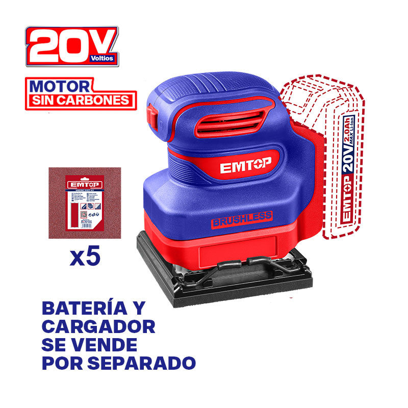[ELSHS2024] -Lijadora Orbital 1/4 De Hoja Inalambrica, 20v. Brushless, 12,000 Rpm, Sin Bateria Ni Cargador, (Bare Tool). Emtop